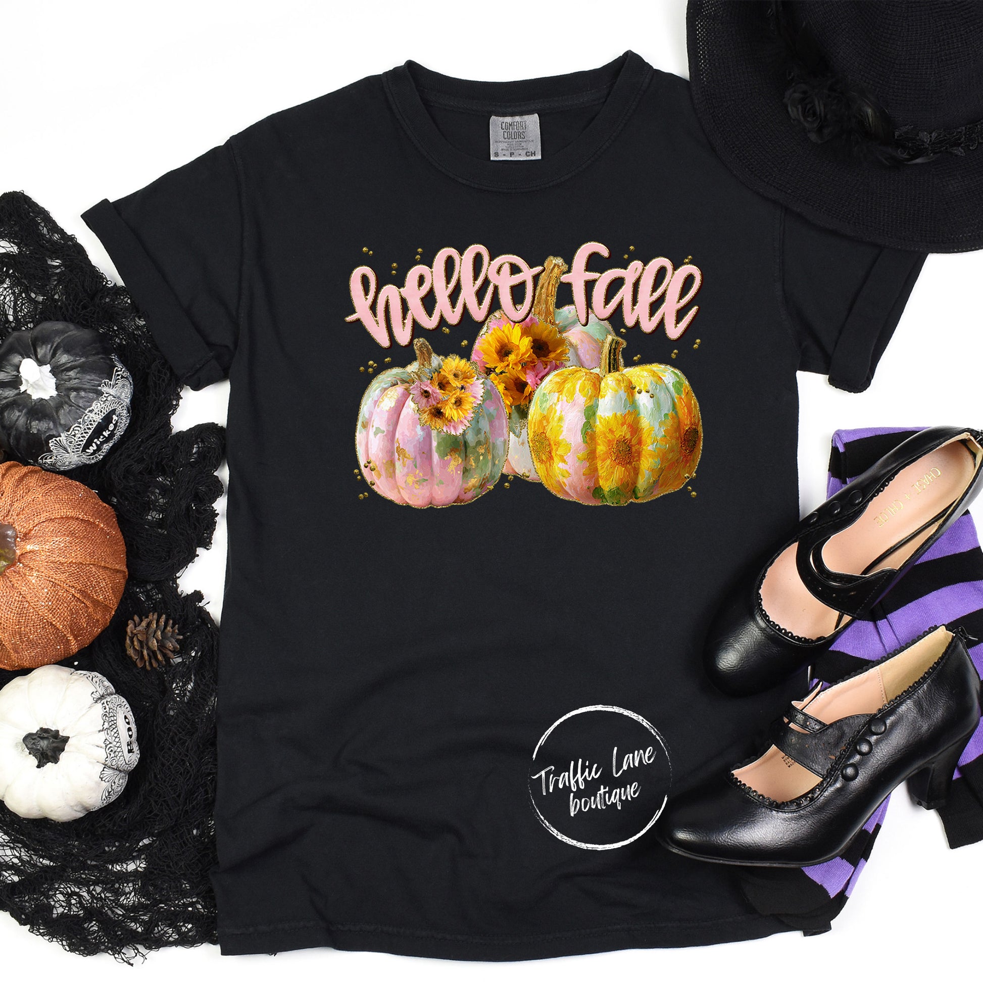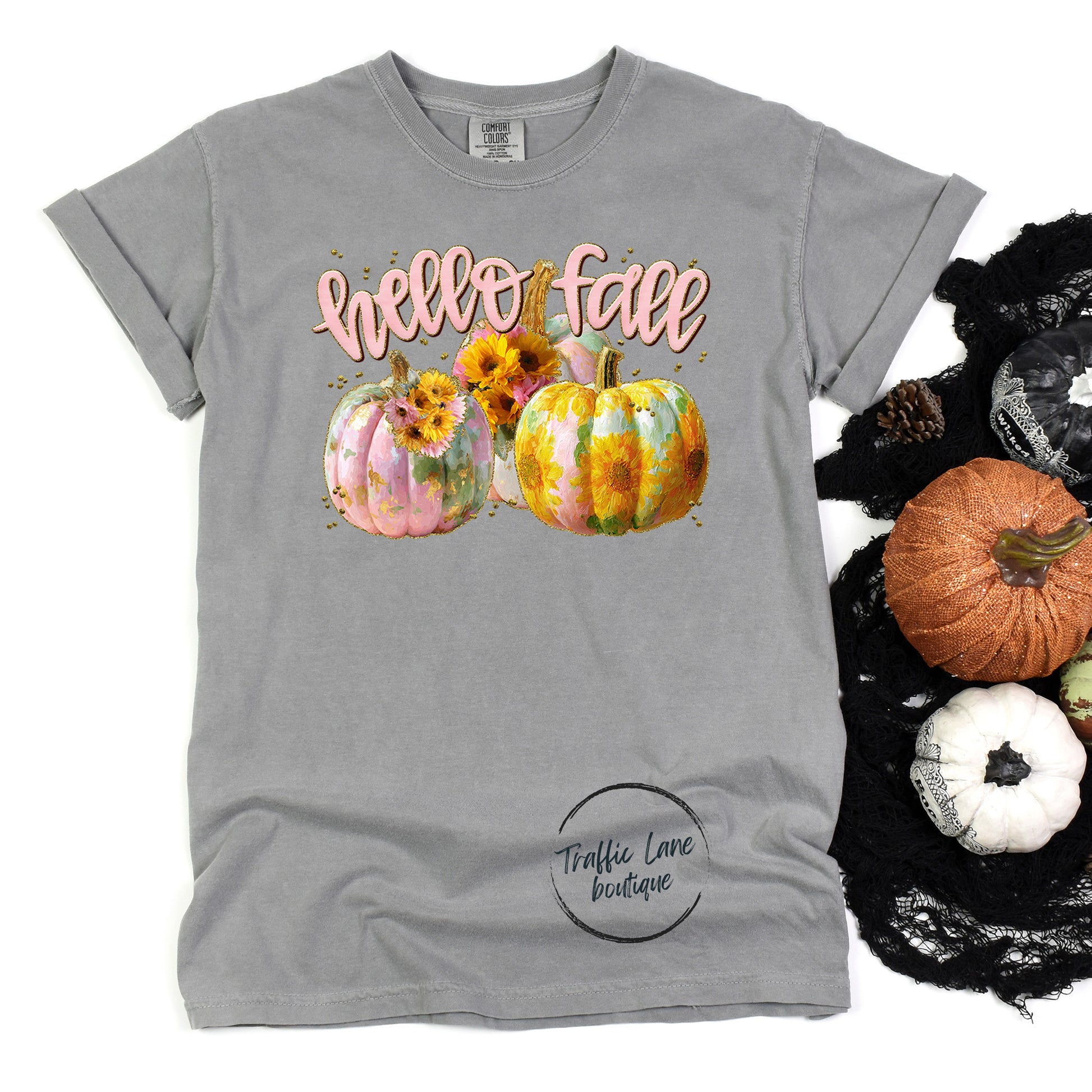 Hello Fall Pink Pumpkins shirt - cozy fall vibes, perfect for crisp days & lattes.