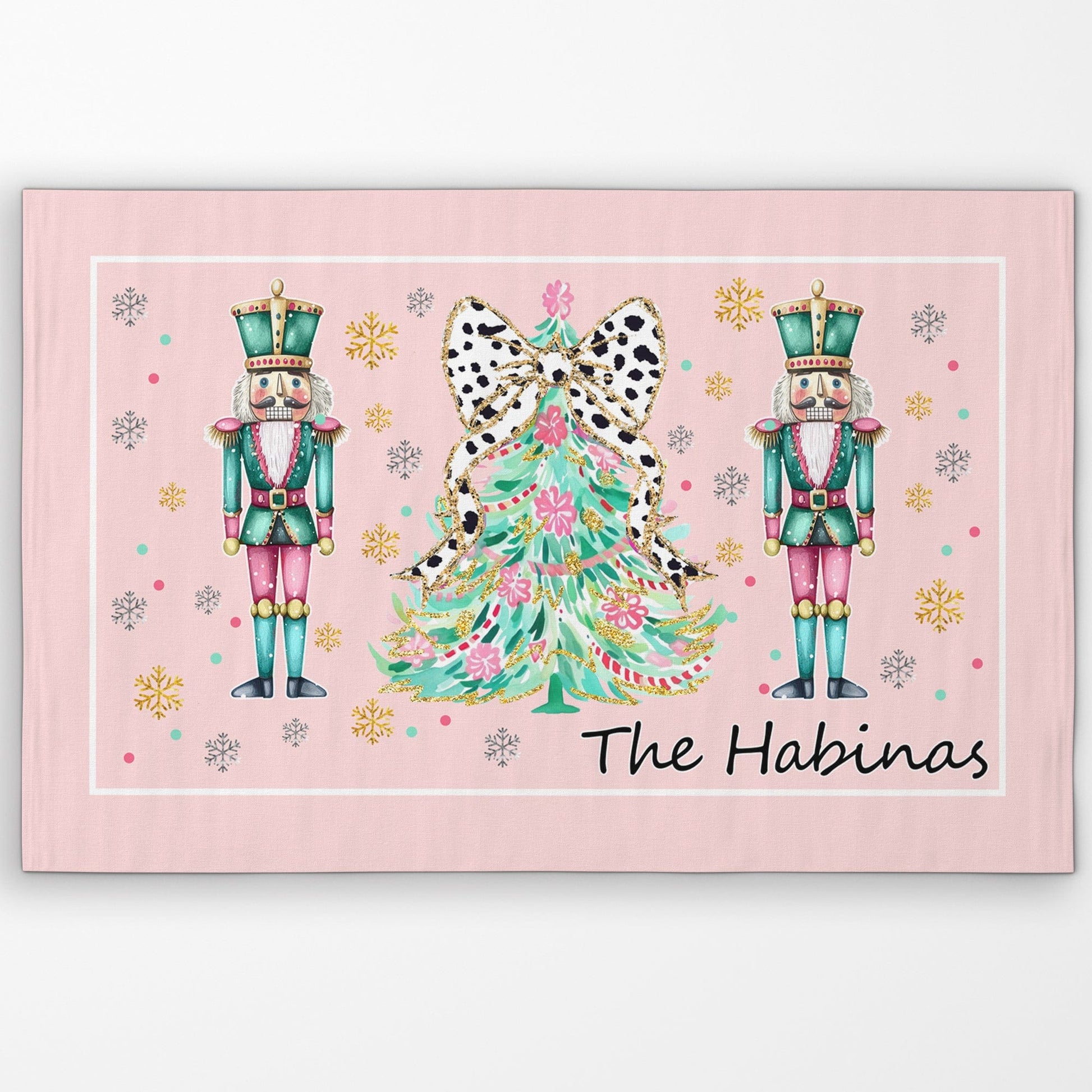 Welcome your guests with festive cheer this holiday season with our Pink Nutcracker Personalized Christmas Door Mat. Measuring 19x31 inches, this mat is a perfect fit for any front door and can be personalized with your family's name. Spread joy and holiday spirit with this playful and unique door mat.