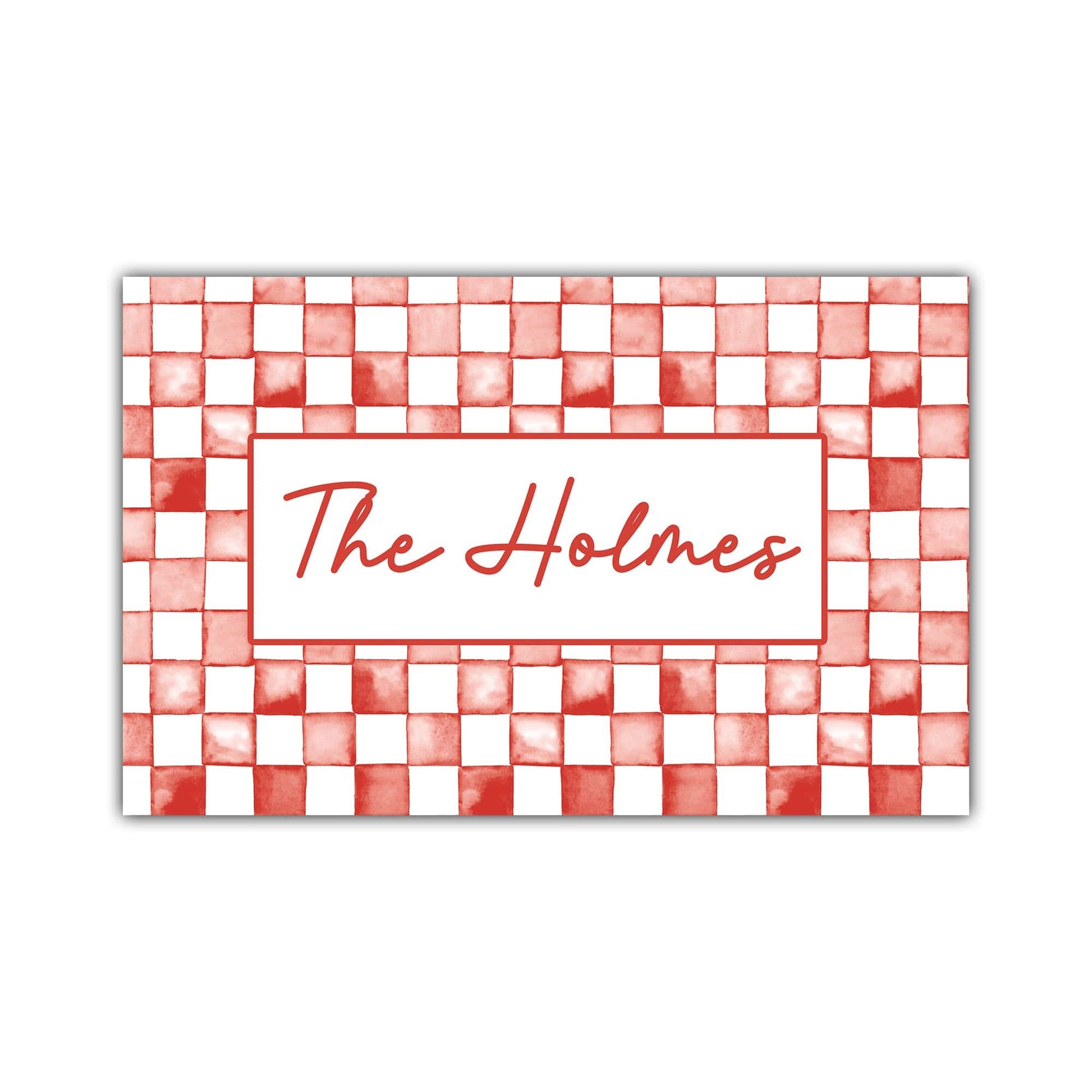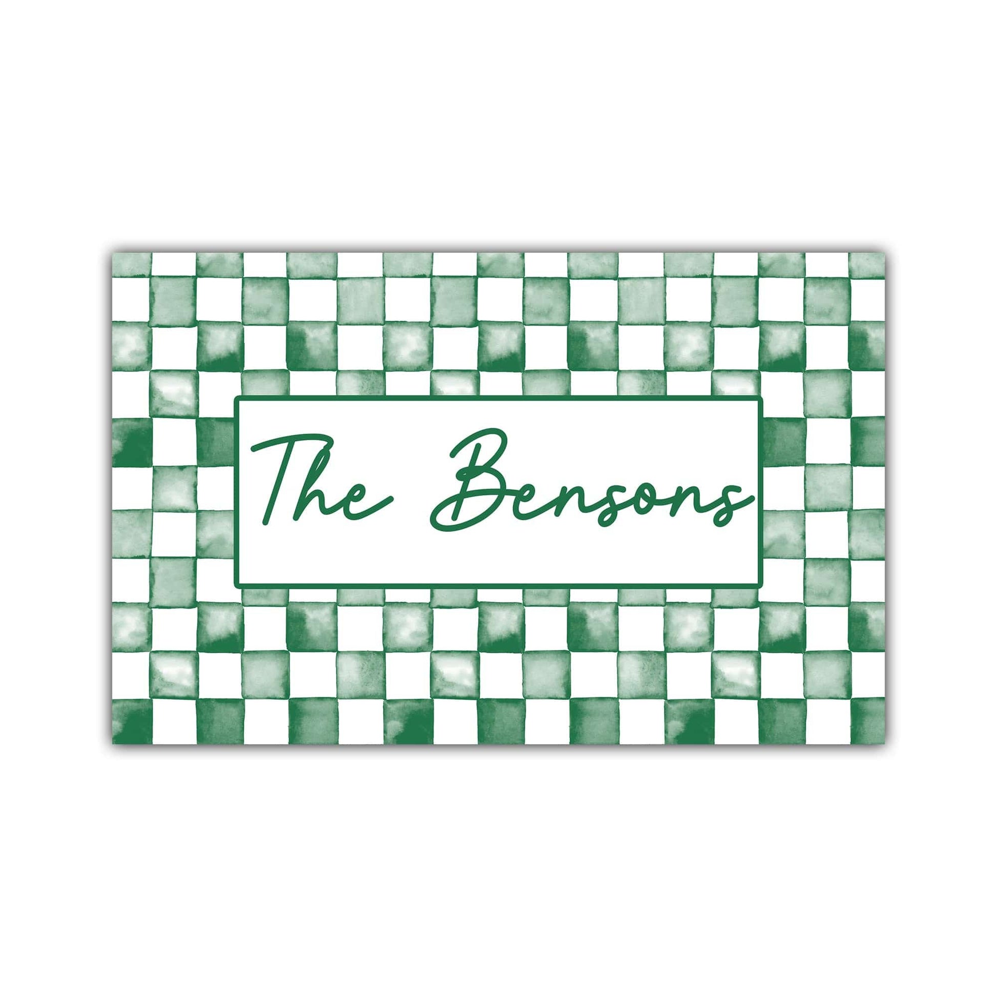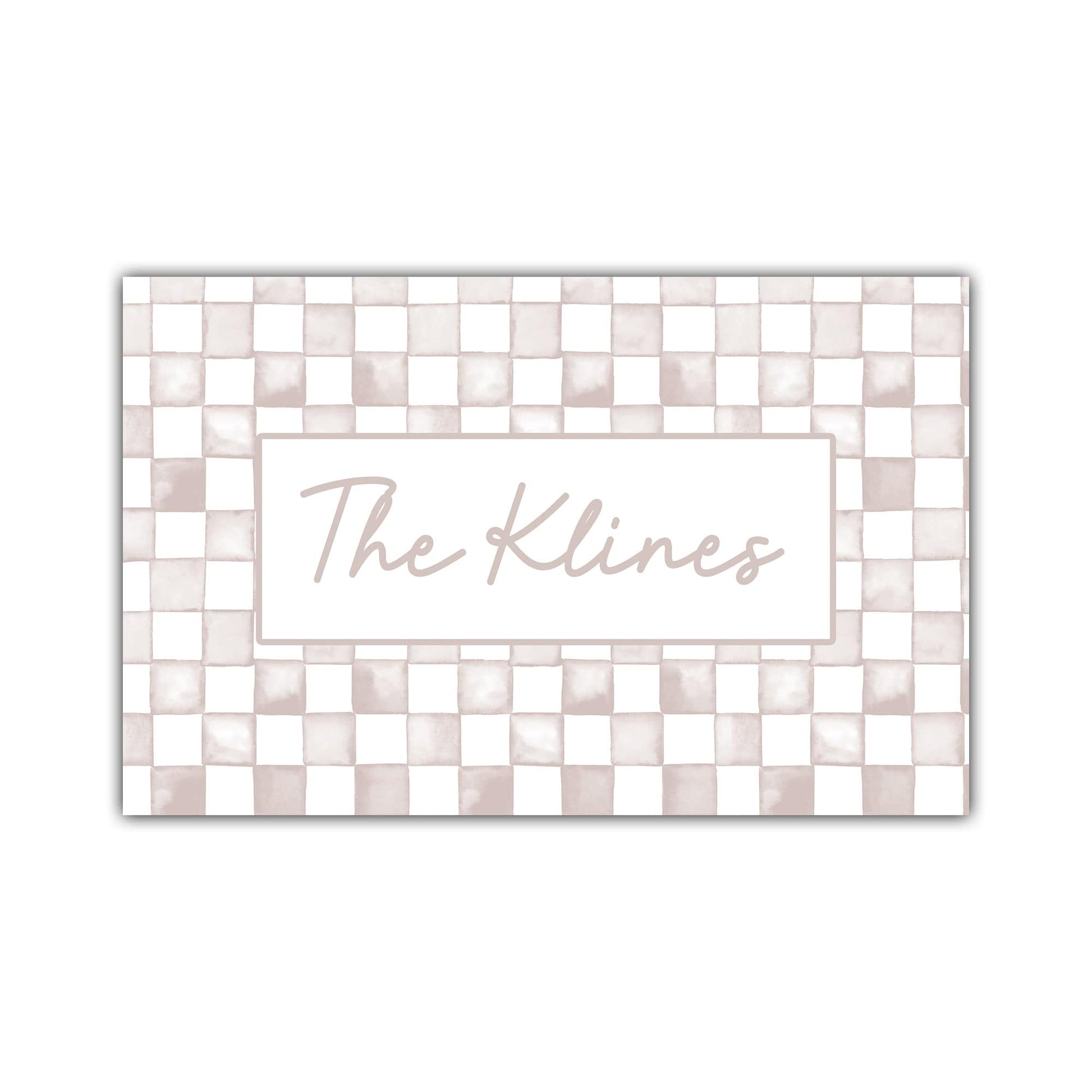 Welcome guests in style with this charming personalized door mat featuring a delicate watercolor check print. Customize it with a name or single line of text to add a personal touch to your entryway. Measuring 21 x 30 inches, it's perfectly sized for indoor spaces and coordinates beautifully with our matching watercolor check tea towels. A fun, functional way to greet visitors with personality.